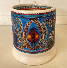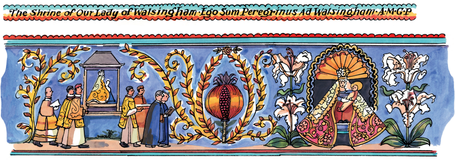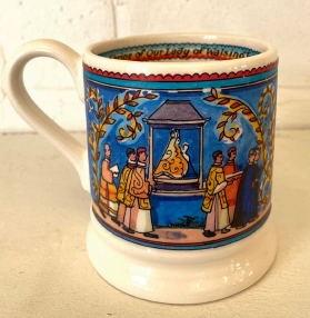 This beautiful mug is hand-made in England. It features a custom design for the Shrine of Our Lady of Walsingham, featuring the procession of Our Lady, and the image in the Holy House, and also includes the Latin phrase 'Ego Sum Peregrinus Ad Walsingham AMGP' (I am a pilgrim to Walsingham)