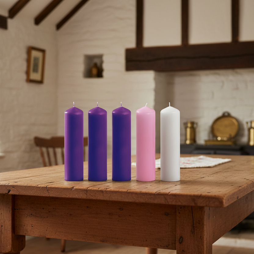 A refined collection of five Advent candles, each measuring 8 inches tall and 2 inches in diameter. This traditional set comprises three deep purple tapers, one rose-hued candle, and one ivory pillar—the classic colour progression for the liturgical season. Perfect for creating a meaningful focal point during your Advent observance.