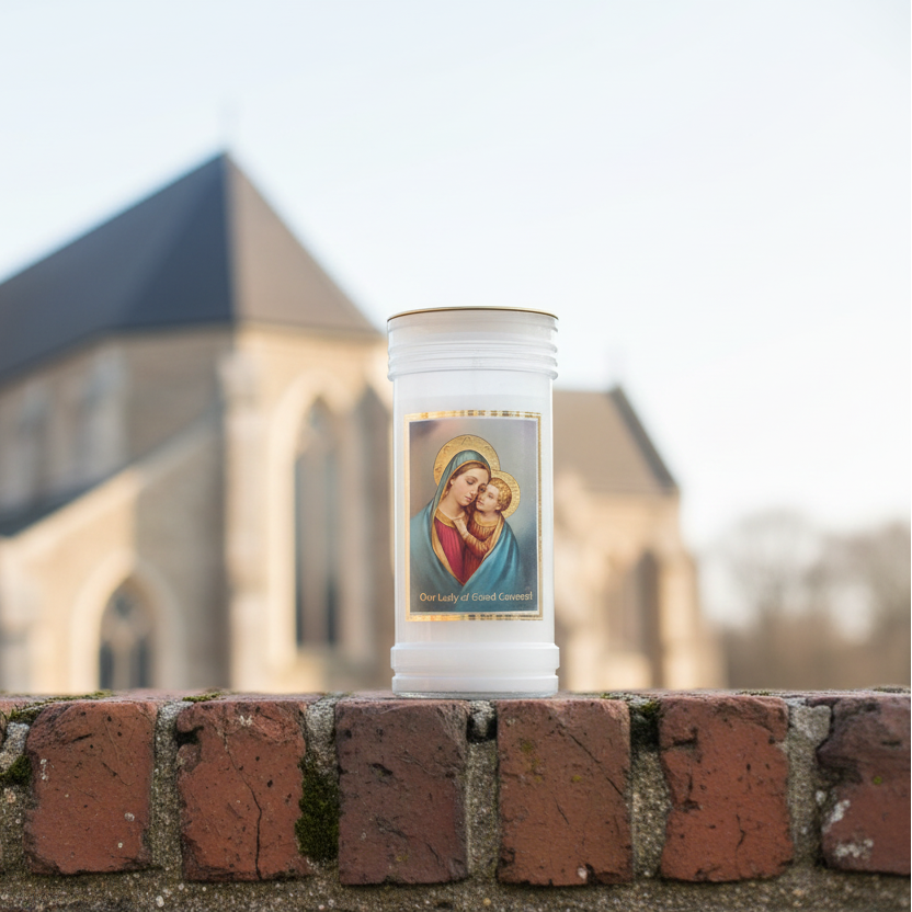 This devotional candle honors Our Lady of Good Counsel, patroness of wisdom, guidance, and clarity in times of uncertainty. Traditionally invoked when seeking direction, discernment, or peace of heart, her image serves as a reminder to trust in divine counsel and gentle guidance.