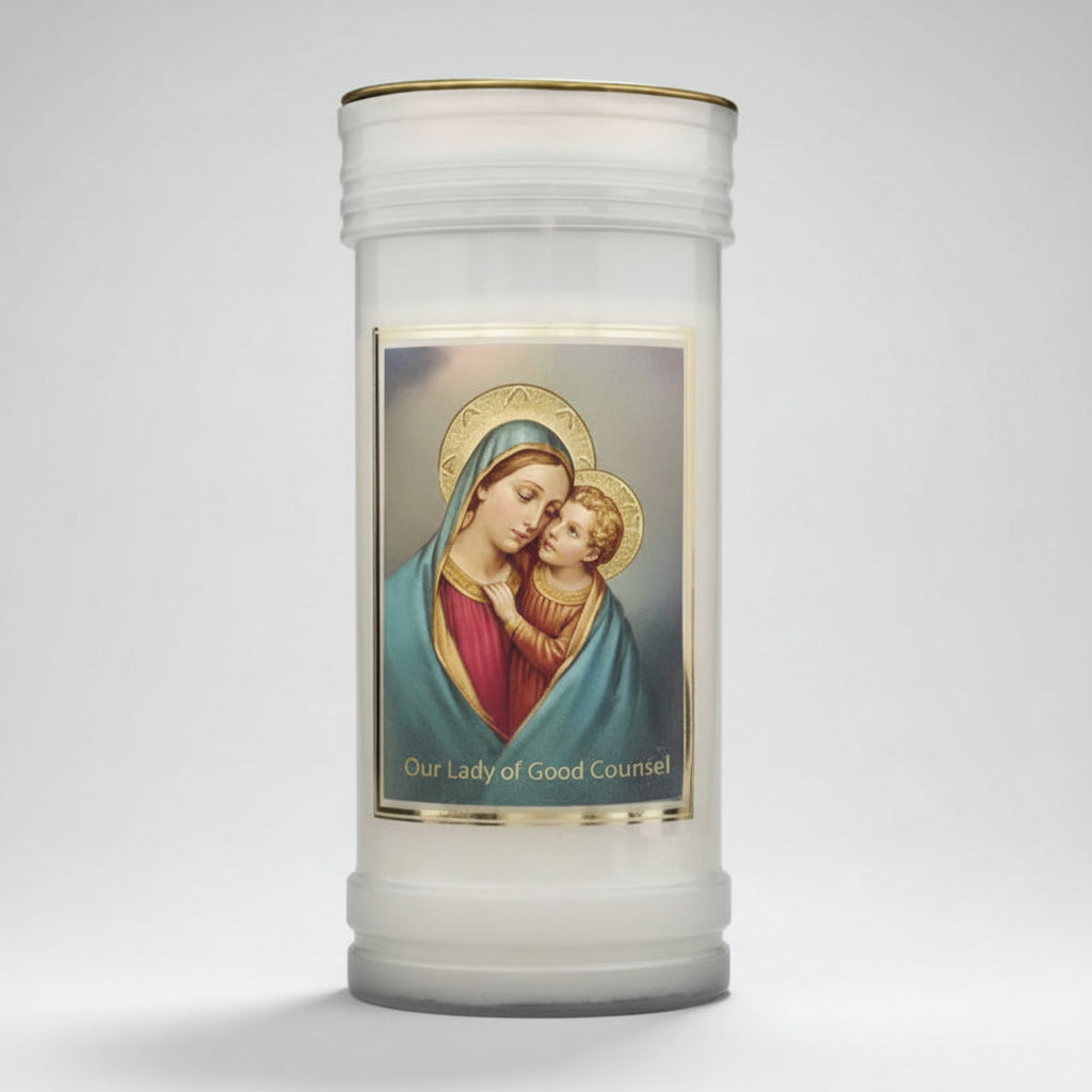 Crafted for extended prayer and reflection, this candle offers a clean, steady burn of up to 72 hours, making it ideal for novenas, personal devotion, or quiet moments of meditation. A printed Prayer to Our Lady of Good Counsel appears on the reverse, allowing the candle to serve as both a source of light and a companion in prayer.