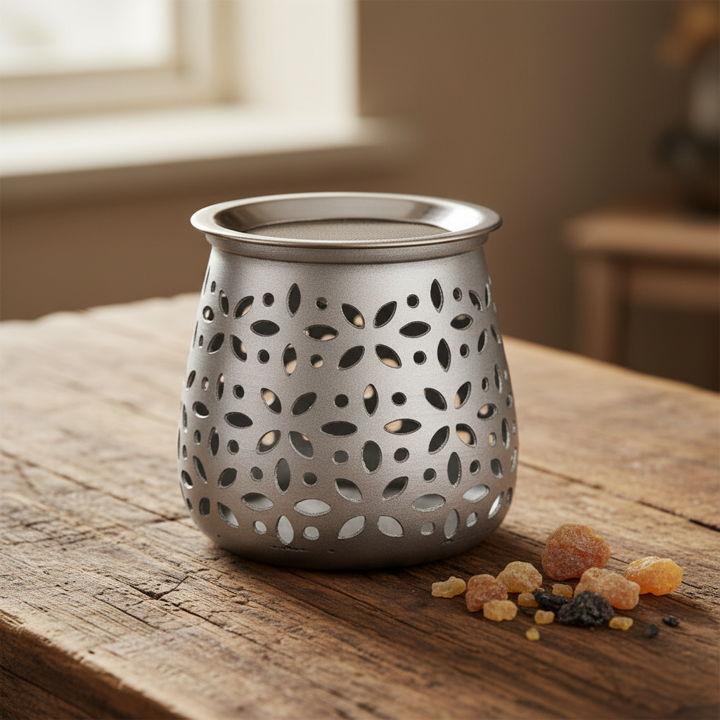 Elegant aluminium incense burner in silver finish, perfect for creating a serene atmosphere in any space. Standing 8 cm tall with an 8 cm diameter, this compact burner operates simply with a standard tea light to gently warm and diffuse your chosen frankincense. Compatible with all incense varieties, it combines timeless design with practical devotional use. Ideal for meditation, prayer, or everyday spiritual practice.