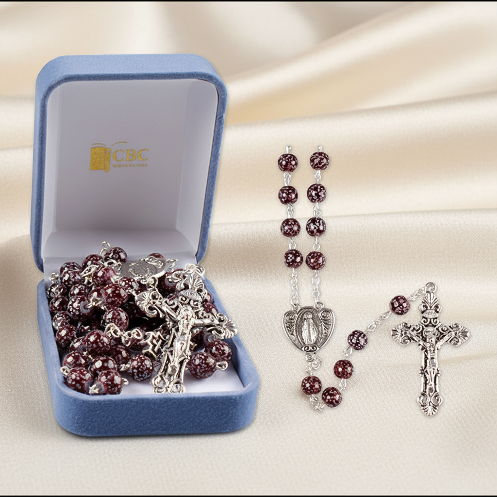 This elegant rosary features 8mm two-tone amethyst glass beads with a distinctive marble effect, creating a refined aesthetic for daily devotion. The piece is completed with a metal cross, Our Father beads, miraculous medal junction, and metal crucifix, each element crafted to complement the serene beauty of the amethyst stones. A timeless choice for those seeking spiritual practice paired with understated sophistication.