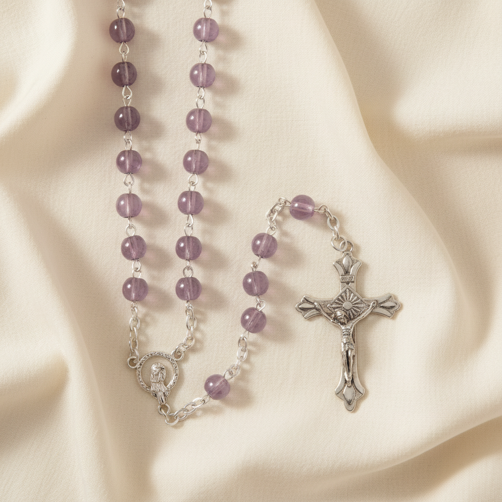 Handcrafted with meticulous attention to detail, this rosary features lustrous glass beads paired with a refined metal crucifix and centrepiece. Each link is forged from durable metal, ensuring this devotional piece withstands years of faithful use whilst maintaining its elegant appearance.