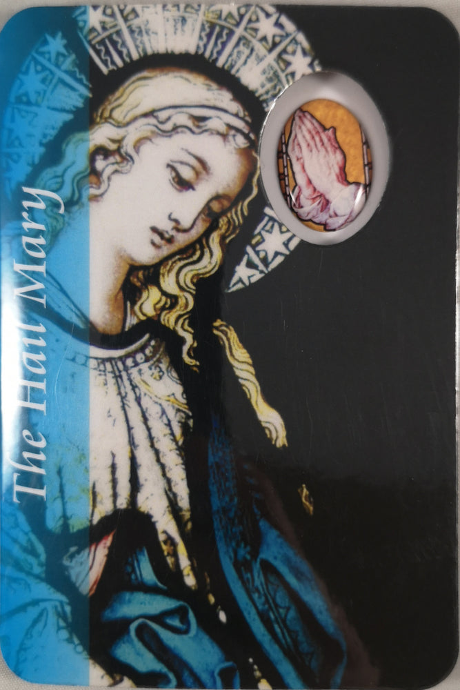 This popular prayer card is in the form of a booklet. On the front cover the text reads "The Hail Mary" and there is an oval hole through which one can see the image of praying hands on the inside top right corner. Inside can be found the Hail Mary prayer.