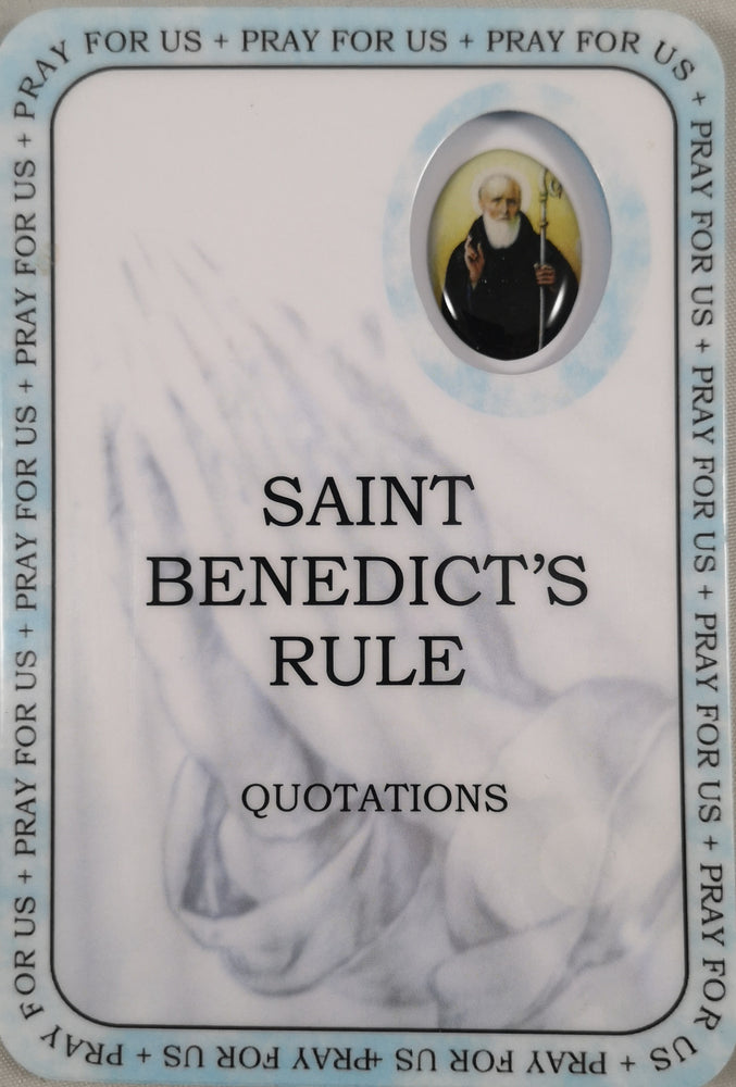 This popular prayer card is in the form of a booklet. On the front cover the text reads "Saint Benedict's Rule" and there is an oval hole through which one can see the image of Saint Benedict himself on the inside top right corner. Inside can be found texts of a book of precepts.