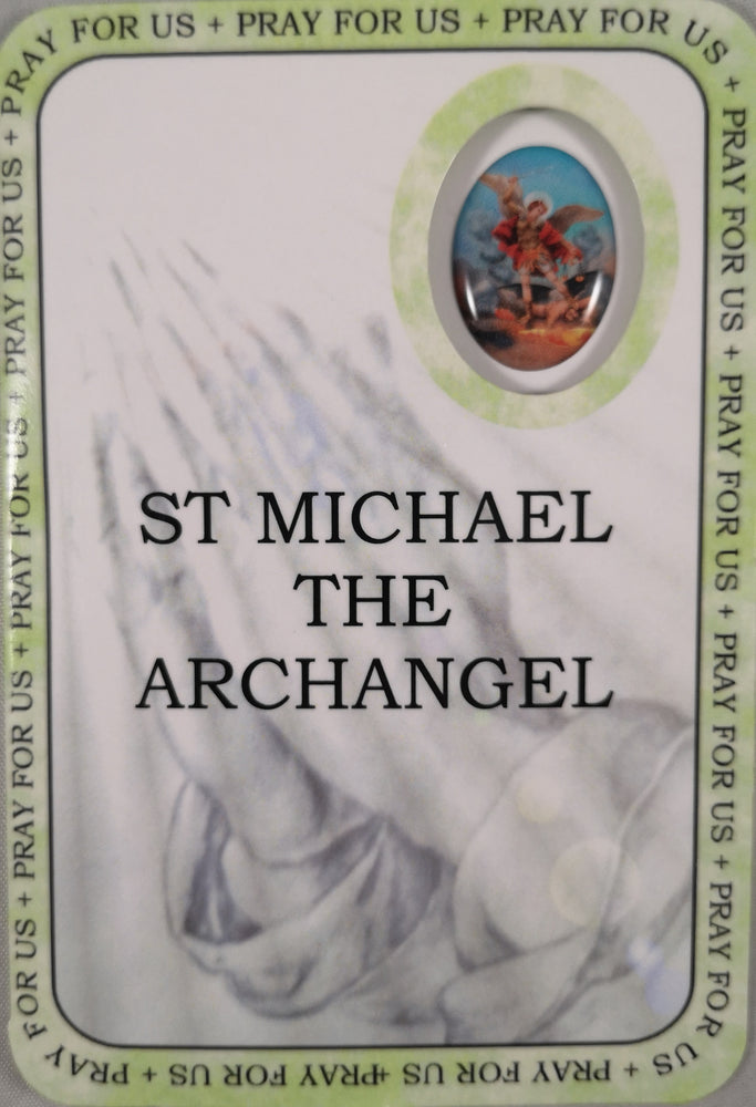 This popular prayer card is in the form of a booklet. On the front cover the text reads "Saint Michael the Archangel" and there is an oval hole through which one can see the image of him on the inside top right corner. Inside can be found texts of prayers to St Michael.